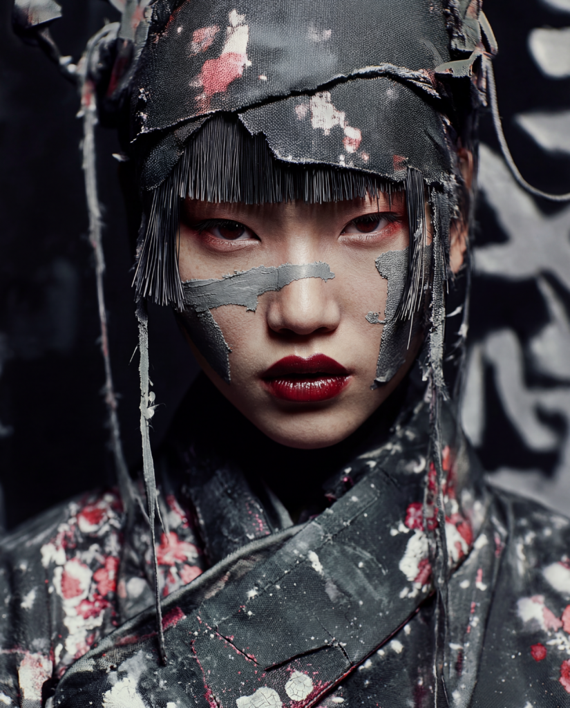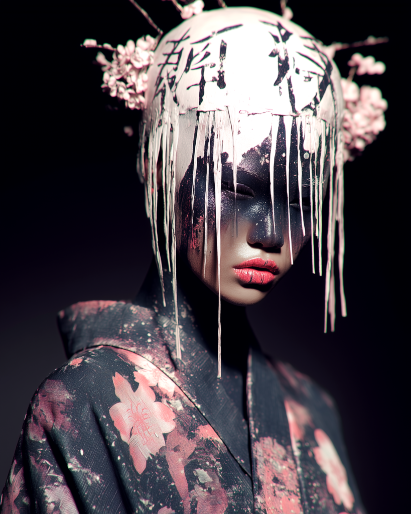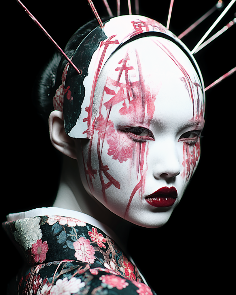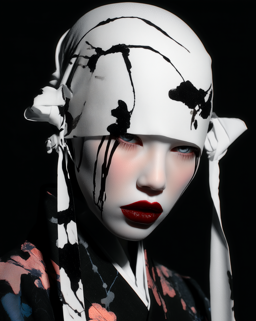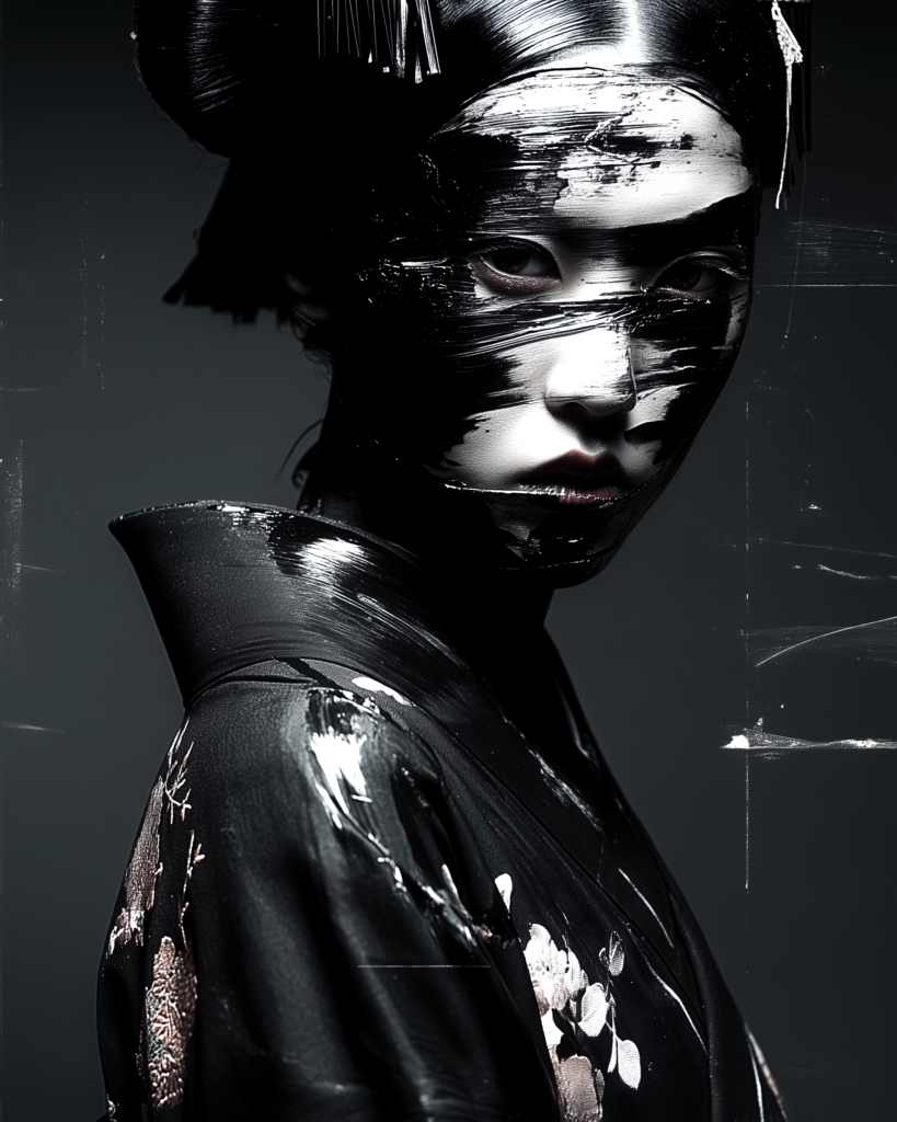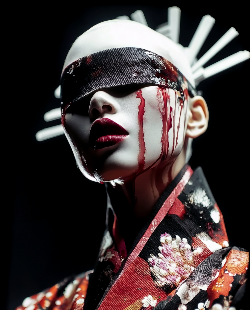 In Silenced Geisha, the face becomes paper. The skin becomes surface. Ink does not embellish, it cuts through. It blinds the eyes yet sharpens inner vision. It traces the lips yet does not silence the voice.
